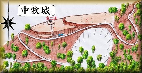 県道36号線から北尾方向に向かう林道の途中の尾根上部分が中牧城の跡である。1郭の入口には貯水槽があるのが目印となっている。そのすぐ脇に1郭への登り口もある。