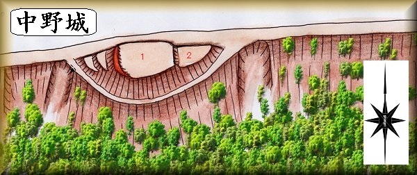 中野城は、萩野森の家の北側にそびえている山稜(小根山)に築かれており、googlemapにも掲載されている。尾根上を舗装林道が通っているので、アクセスは容易である。
