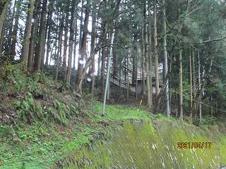 | 神社に続く尾根。意外にきつい坂道だ。脇に水道施設がある。 | 古山神社の建てられている4郭。 |