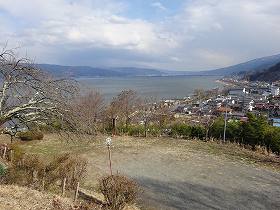 | 南東側から遠望する花岡城。比高30mほどの、諏訪湖に臨む独立台地である。 | 駐車場から諏訪湖方向を見たところ。 |