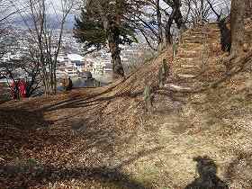 | 1郭から遠望する諏訪湖。 | 北側の腰曲輪群。 |