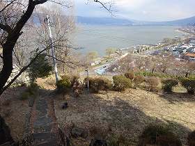 花岡城は諏訪湖に面した地形にあるため、諏訪湖の眺望を楽しめる位置にある。この城では景色も楽しむことができるのであった。かつては城のすぐ下まで湖面が迫っていたのであろうか。