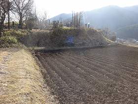 台地縁にある方50mほどの畑が城の中心部であったと思われる箇所である。この南側にわりあい明確に堀の跡が残されており、これが唯一といっていい城郭遺構らしく見える部分となっている。
