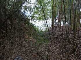 看板の所から少し下って行ったところに堀切跡と思われる地形が見られた。これがかつての城の残存遺構の一部なのであろうか。