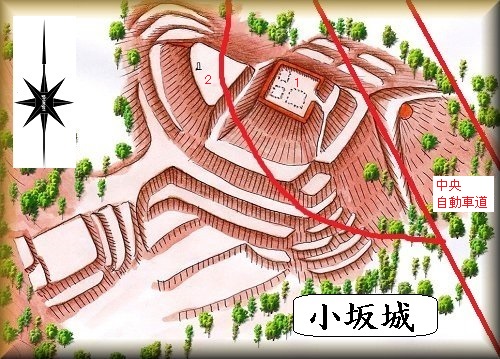 小坂城は、小坂の雨宮神社の西側一帯にありgooglemapにも掲載されているのだが、現在は中央自動車道によって大半を削り取られてしまっている。したがって、右の鳥瞰図は『信濃の山城と館6』掲載の図に完全に頼り切ったものである。