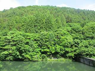 搦手の登城口は、ダムの東側のこの地点にある。駐車場はないが、少し西側に戻ったところの道路に余白があるので、そこに停めさせていただいた。