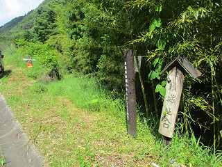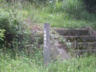 | 山麓にある高村番所の高札場跡。この右手の坂の上に「高城跡入口」の標柱がある。 | 高村番所の標柱。一段低いところに立てられている。 |