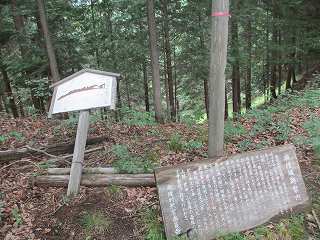 | 1郭堀切の側面部。 | 1郭にある城址標柱。英語の表記もあるのが珍しい。 |