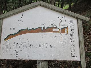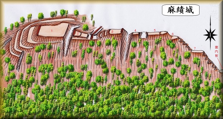 | 案内板の縄張図。 | 尾根から右手に折れて急峻な山稜を登って行く。あと比高80mほどだ。途中に7,6の郭がある。 |