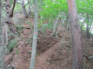 この先城址方向に向かうには尾根の右手に進んで行く。すると急峻な斜面になる。ここからは本当に急斜面の道である。その急斜面にジグザグの通路が付けられているので、比較的登りやすい登山道となっていた。