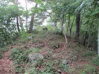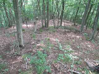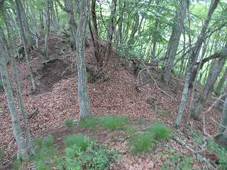 そこから先は緩やかな降り斜面となって、その先の鞍部を掘り切って南側の区画としている。それなりの広さの郭があるのはここまでである。