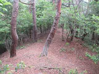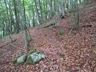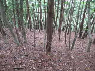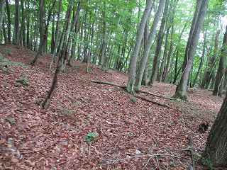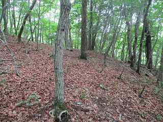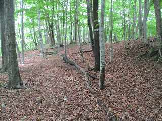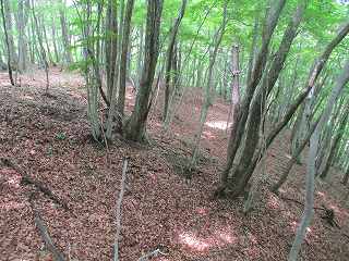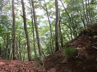 ここから傾斜は比較的緩やかになって行くが、やはり斜面直登を続けていく。そうしているうちに加工は甘いが帯曲輪状の場所に到達した。斜面を切岸加工したために生じたものであろうか。