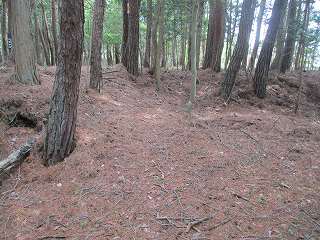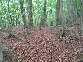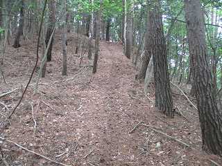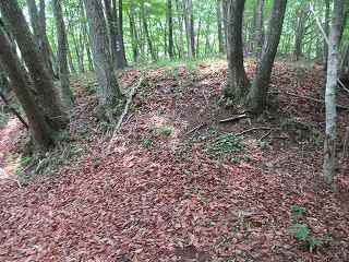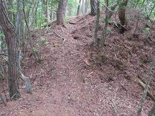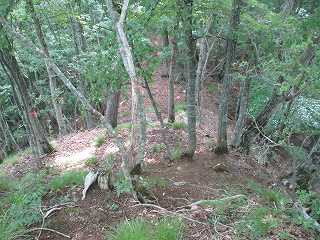 その先はまた下りの斜面となって行く。鞍部には若干の平場があり、その先にも堀切状の区画がある。ただし、これは堀切というよりは切通しの通路であり、西の下方に山道が続いている。西側山麓のどこかから搦手の通路が付けられているようである。