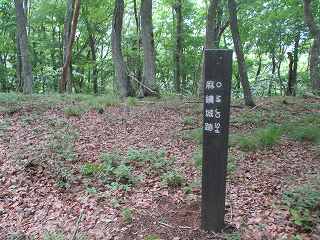 それを上がって平場に出ると、通路はなく、この先どちらに進めばいいのか一瞬迷ってしまう。しかし慌てなくてもよい。前面の尾根方向にやはり「麻績城址道標」と書かれた標柱が見えているので、それを目指す。