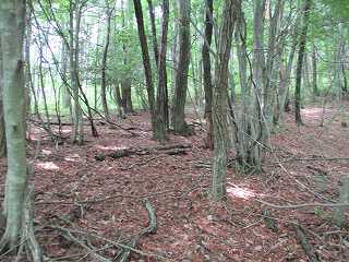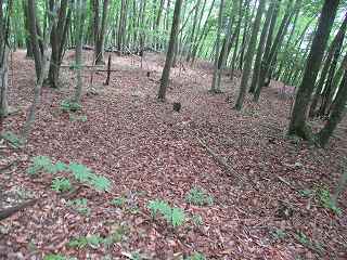 | 急斜面を比高100mほど登って行くとAの平場に到達するが、削平や切岸の跡は見られず自然地形のようだ。 | そこからは比較的緩やかな斜面を登って行くと帯曲輪のようなものが見られる。ただし加工は甘い。 |