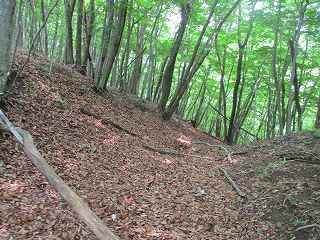 ここはかなりの急斜面なのでよじ登るような感じで登って行く。少しでも傾斜の緩やかな場所を探し木を掴むようにしながら一歩一歩這うように進んで行くのである。かなりきつい斜面である。