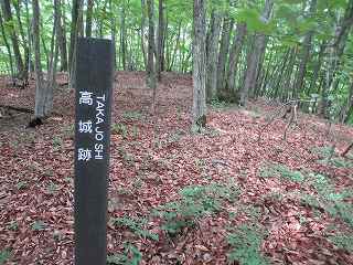 | 高村番所脇にある高城入口の標柱。これを見た時は、城内まで遊歩道が付けられていると思ったのだが・・・・甘かった。 | 墓地を過ぎて進んで行くと根小屋と思われるような平坦で横に長い平場が現れてきた。その先に林道があり、そこからは急斜面直登となる。道はない。 |