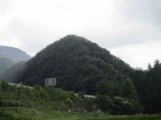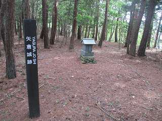| 北方から遠望する矢倉城。ここからの比高は120mほどある。 | 矢倉城入口の標柱。高速のトンネルを抜けてすぐのところである。 |