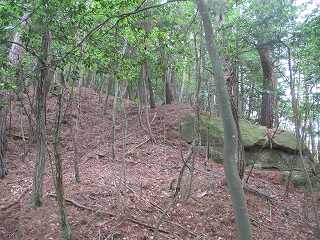 | しばらくすると、また帯曲輪が見えてきた。 | さらに登って行くと、段々の郭群と土塁とが見えてくる。土塁には岩もある。この辺りからが主城域となる。 |