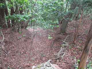 | 3郭の先は3段の急斜面の降りとなっている。 | 2郭から見た1郭の堀切。深さは2m程度と、浅いものである。 |