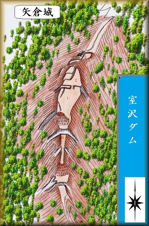 室沢ダムの西方にそびえている比高120mほどの山稜が矢倉城の跡である。