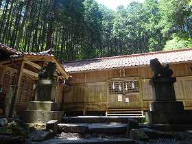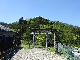 | 居館跡から遠望する大屋城。この辺りからの比高は100mほど。ここから鞍部に降ってさらに登って八幡神社に至る。 | 山麓にある八幡神社。 |