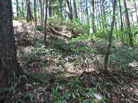 | 西側の伊奈川に架かる橋から遠望した須原城。ここからの比高は100mほど。右上の方に鉄塔が見える。あれが目印である。 | 登り口が分からなかったので、東南の山麓にある民家の脇から直登していった。すると2郭に出た。写真は2郭西側の堀切。 |