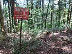 すると山頂近くなって、腰曲輪状の平場が現れた。しかし、それほど造成はしっかりしていない。それを2段ほど過ぎると山頂に到着。山頂に看板が立てられているのが見えたので「こんな山城にも案内板があるのか」と意外に思ったのであるが、実際に看板に書かれていたのは「鳥獣保護地区」という文字だけであった。