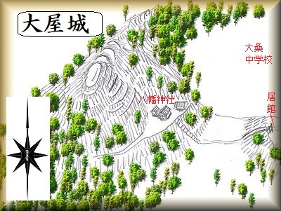 大桑中学校の南西側にそびえている比高100mほどの山稜が大屋城の跡である。山麓近くには八幡神社が祭られているので、これを目指していく。