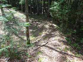 6郭からは、下に降りていく山道が見えた。これが鉄塔への取り付け道であったようである。しっかりとした山道で、これを降って行くと、東側の道路沿いの所に出た。須原城を訪れる際には、この東側の山道を登って行くのが、一番訪れやすいルートである。これから訪れる人はここからアクセスするとよいと思う。