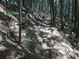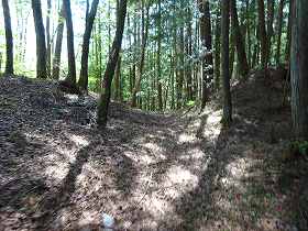 西側に向かうとまず堀切があり、その先に幅広の土塁が見えている。堀切の間には土橋が付けられている。この堀切を越えるとその先の1郭との間にも堀切が掘られていた。いずれも深さはそれほどではないが、二重堀といった構造となっている。この堀底から1郭に向けて虎口が開口しており、1郭内部と接続している。