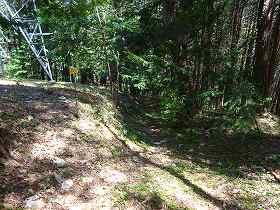 しかし、登る際にはこの入口が分からず、どこから取り付いていいのかわからなかったので、南側の民家の脇からテキトーによじ登ってみることにした。けっこうな急斜面であったが、ここからの比高は80mほどなので、それほど大変ではない。進んでいけば鉄塔への取り付け道と合流するだろうと思ってよじ登っていくと、、結局、鉄塔の道と合流することはなく2郭に到達した。すぐ先には鉄塔も見えている。鉄塔の道路はもっと東の方向だったようだ。
