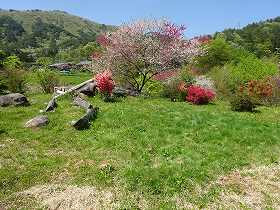 これを越えて回り込んで入ったところが本城である。案内板も何もないが、本城には山桜や藤棚があって、花が咲き誇っていた。