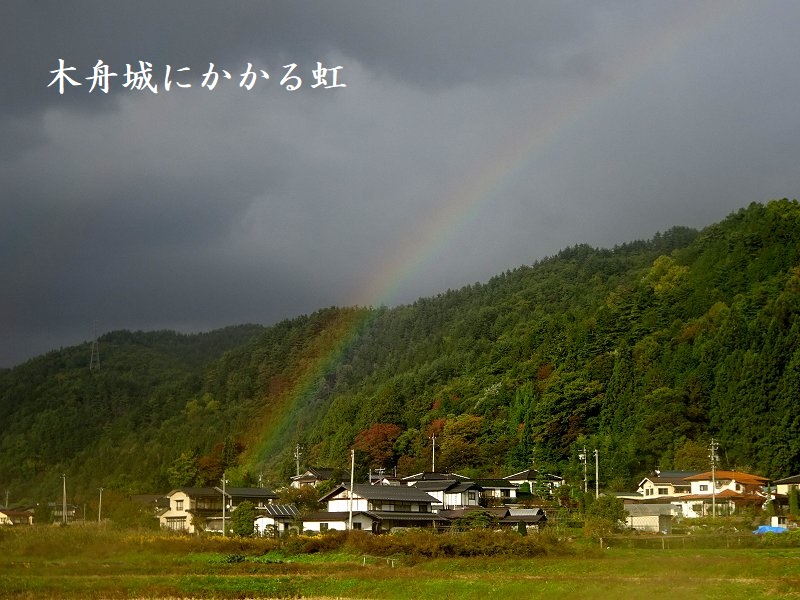 ところが、車に乗り込んで運転を始め、最後にもう1度と思って城山の方を振り返ってみると・・・・城山には虹がかかっていた! 美しい虹だ! 思わずカメラを構える。下の写真がそれである。写真では今一つきれいに映っていないのだが、実際にはもっとくっきりと見えていた。6000城目の思い出にふさわしい光景だ、と感じた。天が6000城達成を祝福してくれたのか。この日見た虹は、この先も、ずっと忘れないことだろう。