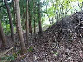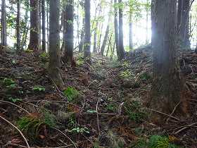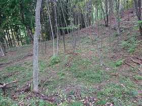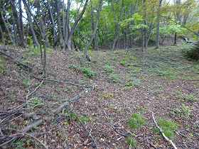 | ここからの尾根には段郭が多数造成されており、しっかりと加工されているのが分かる。途中には堀切も見られる。 | Iの郭の側面部を見たところ。しっかり加工されている。この下には面積のあるHの郭がある。 |