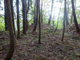 2郭の先は北西側の堀切の部分に接続している。ここから先も尾根は緩やかに北側に延びていく。この辺りは自然地形のままのようだが、かなり広大な面積がある。さすがにこの辺りまで削平するほどのエネルギーはなかったのであろうか。もっとも未加工の部分があるとはいっても、加工された部分の広大さの有用性が薄れるというわけではない。
