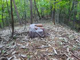 | さらに進んで行くとGのピークがあり、祠が祭られていた。 | Gの背後にある堀切。 |