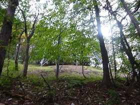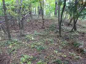 | 1かうからの竪堀の途中に2郭への虎口と土橋とがある。 | 2郭内部。けっこう広い。土橋と虎口で区画された独立性の高い空間であるが、敵を撃退するための空間でもある。 |