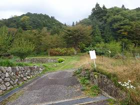 木舟城は、常福寺の東側にそびえる比高200mほどの山稜一帯に築かれていた。登城口は何カ所かあるようだが、私は常福寺から背後に回り込んで谷戸部に続く林道に出た。この林道の入口は、この辺りにある。ただし、上記の通り、案内表示も何もない。