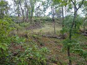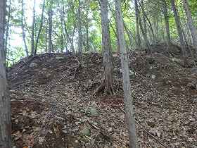 | その先の城塁は非常に急峻でよじ登っていくしかない。本来の登城道はどこにあるのだろうか。 | その上のJの郭は、土塁状に囲まれるような構造となっている。 |