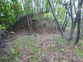 北城で面白いのは2の郭である。1郭から北西に延びた尾根との間の部分から北側の斜下方にかけて竪堀が掘られている。その竪堀の途中に虎口があり、間の土橋と2郭とが接続されている。普通の堀切の途中に虎口と土橋があるのはよく見かける光景なのだが、竪堀の途中に土橋と虎口とがあるのは初めて見た。面白い構造であるが、この土橋は1郭下の堀切の所へと続いており、東側の尾根から接近する敵は、竪堀と虎口を経由して2郭に入ってくるようになっている。もちろんその間、上の城塁からの攻撃にさらされてしまうというわけである。2郭は広い居住空間であるとともに、進入した敵を撃退するための迎撃空間でもあったようだ。