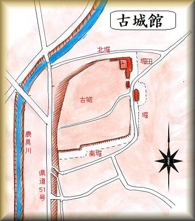 県道51号線から北側に上がって行くと、その辺りがすでに城内ということになる。農具川に臨む微高地の北西端に位置している。この台地縁部を古城(ふるじょう)と呼んでいるようだ。