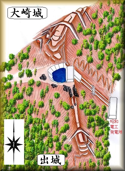 大崎城は、大崎にある昭和電工の水力発電所の背後にそびえる比高90mほどの山稜に築かれていた。