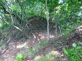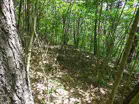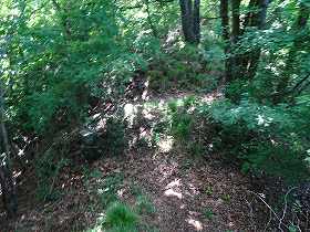 | 東側尾根の堀切はヤブだらけでよく分からない。 | 西側尾根には6本の堀切がある。最初に見える2重堀切。 |