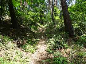 | Cの部分の切岸と平場。 | 山頂に近づくと、道は切り通し状になる。 |