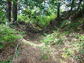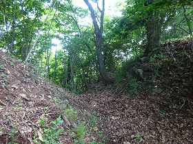 | 1郭背後の二段堀切。 | 城域を区画する三水城側の堀切。 |