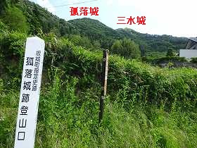 この神社入口に「孤落城・三水城登城口」の案内が出ている。ここから孤落城までは比高250m、さらに三水城までは比高120mといったところであろうか。
