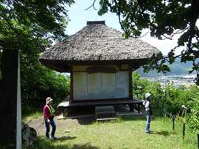 | 神社を過ぎ登山道脇にある十六夜観月殿。ここからいよいよ山登り開始である。 | 城に行くまでの途中にも、このような人工的な構築物が見られる。 |