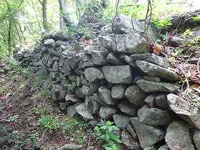 この上が1郭である。急峻な山城であるにもかかわらず1郭の側面部にはかなりしっかりとした石垣が残されていた。いったいどこからこれらの石を運んできたものであろうか。それほど大きな石ではないとはいえ、ここまで運んでくる労力は大変なものだったことであろう。