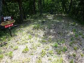 | どんどん進んでいくと、そこにけっこう広い駐車スペースがあった。ここに車を停め、徒歩で山道を進んでいく。 | 尾根の一段下にあった平場。人工的なものであるが、力石の人たちの耕作地であったとのことである。正面奥の土手上が尾根。 |